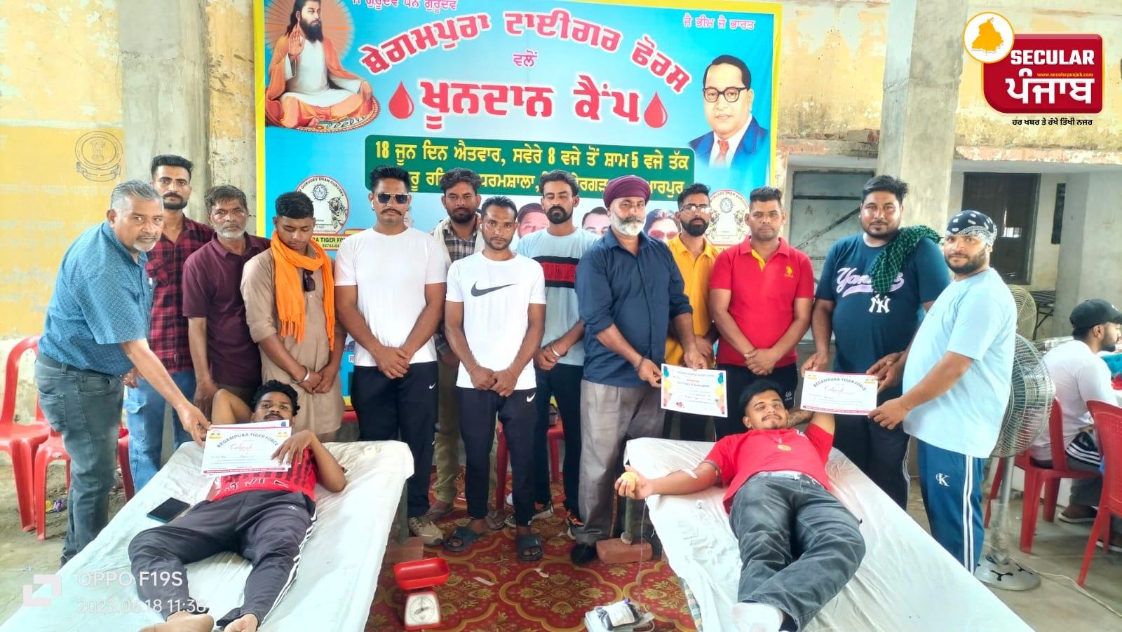 ਹੁਸ਼ਿਆਰਪੁਰ 19 ਜੂਨ ( ਤਰਸੇਮ ਦੀਵਾਨਾ ) ਬੇਗਮਪੁਰਾ ਟਾਈਗਰ ਫੋਰਸ ਵੱਲੋਂ ਨਜ਼ਦੀਕੀ ਪਿੰਡ ਸ਼ੇਰਗੜ੍ਹ ਵਿਖੇ ਬਲਾਕ 2 ਦੇ ਪ੍ਰਧਾਨ ਸਤੀਸ਼ ਕੁਮਾਰ ਸ਼ੇਰਗੜ ਅਤੇ ਬਲਾਕ 2 ਦੇ ਉੱਪ ਪ੍ਰਧਾਨ ਰਾਜ ਕੁਮਾਰ ਬੱਧਣ ਵਲੋ ਸਤਿਗੁਰੂ ਰਵਿਦਾਸ ਧਰਮਸ਼ਾਲਾ ਵਿਖੇ ਇੱਕ ਵਿਸ਼ਾਲ ਖੂਨਦਾਨ ਕੈਂਪ ਲਗਾਇਆ ਗਿਆ ਜਿਸ ਨੂੰ ਸਤਿਨਾਮ ਹਸਪਤਾਲ ਦੇ ਬਲੱਡ ਸੈਟਰ ਦੀ ਟੀਮ ਦੀ ਵਧੀਆ ਕਾਰਕੁਜਾਰੀ ਨੇ ਨੇਪਰੇ ਚਾੜਿਆ । ਇਸ ਖੂਨਦਾਨ ਕੈਂਪ ਦੇ ਵਿੱਚ ਬੇਗਮਪੁਰਾ ਟਾਇਗਰ ਫੋਰਸ ਦੇ ਕੌਮੀ ਚੇਅਰਮੈਨ ਤਰਸੇਮ ਦੀਵਾਨਾ ਪੰਜਾਬ ਪ੍ਰਧਾਨ ਪ੍ਰਧਾਨ ਵੀਰਪਾਲ ਠਰੋਲੀ ਦੋਆਬਾ ਪ੍ਰਧਾਨ ਨੇਕੂ ਅਜਨੋਹਾ ਤੇ ਜਿਲ੍ਹਾ ਪ੍ਰਧਾਨ ਹੈਪੀ ਫਤਿਹਗੜ੍ਹ ਨੇ ਵਿਸ਼ੇਸ਼ ਤੌਰ ਤੇ ਸ਼ਿਰਕਤ ਕੀਤੀ । ਕੈਂਪ ਵਿੱਚ ਥਾਣਾ ਸਦਰ ਦੇ ਐਸ ਐਚ ਉ ਡੀ ਐਸ ਪੀ ਲਵਕੇਸ਼ ਕੁਮਾਰ ਨੇ ਆਪਣੀ ਪੂਰੀ ਟੀਮ ਨਾਲ ਪਹੁੰਚ ਕੇ ਹਾਜ਼ਰੀ ਲਗਵਾਈ ਜਿੱਥੇ ਕਿ ਬੇਗਮਪੁਰਾ ਟਾਈਗਰ ਫੋਰਸ ਨੇ ਡੀ ਐਸ ਪੀ ਲਵਕੇਸ਼ ਕੁਮਾਰ ਨੂੰ ਸਿਰੋਪਾ ਪਾ ਕੇ ਸਨਮਾਨਿਤ ਕੀਤਾ ਗਿਆ ਇਸ ਮੌਕੇ ਡੀ ਐਸ ਪੀ ਲਵਕੇਸ਼ ਕੁਮਾਰ ਨੇ ਬੋਲਦਿਆਂ ਕਿਹਾ ਕਿ ਨਸ਼ਿਆਂ ਦੇ ਵੱਗ ਰਹੇ ਛੇਵੇ ਦਰਿਆ ਵਿੱਚੋਂ ਨੌਜਵਾਨ ਪੀੜੀ ਨੂੰ ਕੱਢ ਕੇ ਇਹੋ ਜਿਹੇ ਨੇਕ ਤੇ ਸਮਾਜ ਭਲਾਈ ਦੇ ਕੰਮਾ ਵਲ ਤੋਰਨਾ ਬੇਗਮਪੁਰਾ ਟਾਇਗਰ ਫੋਰਸ ਦਾ ਇਕ ਸ਼ਲਾਘਾਯੋਗ ਉਪਰਾਲਾ ਹੈ ਇਸ ਮੌਕੇ ਫੋਰਸ ਦੇ ਪੰਜਾਬ ਪ੍ਰਧਾਨ ਵੀਰਪਾਲ ਠਰੋਲੀ ,ਦੁਆਬਾ ਪ੍ਰਧਾਨ ਨੇਕੂ ਅਜਨੋਹਾ ਅਤੇ ਜ਼ਿਲ੍ਹਾ ਪ੍ਰਧਾਨ ਹੈਪੀ ਫਤਿਹਗੜ੍ਹ ਨੇ ਸਾਂਝੇ ਰੂਪ ਵਿਚ ਬੋਲਦਿਆਂ ਕਿਹਾ ਖੂਨਦਾਨੀਆਂ ਵੱਲੋਂ ਦਾਨ ਕੀਤੇ ਗਏ ਖ਼ੂਨ ਦੇ ਨਾਲ ਕਿਸੇ ਦੇ ਟੁੱਟਦੇ ਸਾਹਾਂ ਨੂੰ ਨਵੀਂ ਜ਼ਿੰਦਗੀ ਮਿਲ ਸਕਦੀ ਹੈ ਜਿਸ ਨੂੰ ਲੈ ਕੇ ਖਾਸ ਕਰਕੇ ਨੌਜਵਾਨਾਂ ਦਾ ਖੂਨ ਦਾਨ ਪ੍ਰਤੀ ਵੱਧਦਾ ਰੁਝਾਨ ਵਧੀਆ ਸੰਕੇਤ ਹੈ ਅੱਜ ਲਗਾਏ ਗਏ ਖ਼ੂਨਦਾਨ ਕੈਂਪ ਵਿੱਚ ਖੂਨ ਦਾਨੀਆਂ ਵੱਲੋਂ ਭਾਰੀ ਉਤਸ਼ਾਹ ਦੇਖਣ ਨੂੰ ਮਿਲਿਆ ਅਤੇ ਖੂਨ ਦਾਨੀਆਂ ਵਲੋ 63 ਯੂਨਿਟ ਖੂਨ ਦਾਨ ਕੀਤਾ ਗਿਆ ਜਿਸ ਤੋਂ ਜ਼ਾਹਿਰ ਹੈ ਕਿ ਨੌਜਵਾਨ ਪੀੜ੍ਹੀ ਖੂਨਦਾਨ ਨੂੰ ਲੈ ਕੇ ਕਾਫੀ ਉਤਸ਼ਾਹਿਤ ਹੋ ਰਹੀ ਉਨ੍ਹਾਂ ਕਿਹਾ ਕਿ ਕਿਸੇ ਵੱਲੋਂ ਦਾਨ ਕੀਤਾ ਗਿਆ ਖੂਨ ਕਿਸੇ ਦੀ ਮੌਤ ਨੂੰ ਜ਼ਿੰਦਗੀ ਵਿੱਚ ਬਦਲ ਕੇ ਨਵਾਂ ਜੀਵਨ ਦੇ ਸਕਦਾ ਹੈ ਇਸ ਮੌਕੇ ਖੂਨਦਾਨੀਆਂ ਨੂੰ ਬੇਗਮਪੁਰਾ ਟਾਈਗਰ ਫੋਰਸ ਵੱਲੋਂ ਸਰਟੀਫਿਕੇਟ ਅਤੇ ਮੈਡਲ ਦੇ ਕੇ ਸਨਮਾਨਿਤ ਕੀਤਾ ਗਿਆ । ਉਹਨਾ ਕਿਹਾ ਕਿ ਹਰ ਇਨਸਾਨ ਨੂੰ ਖੂਨਦਾਨ ਕਰਦੇ ਰਹਿਣਾ ਚਾਹੀਦਾ ਹੈ ਕਿਉਕਿ ਦਾਨ ਕੀਤੇ ਖੂਨ ਦਾ ਇੱਕ ਕਤਰਾ ਕਿਸੇ ਦੀ ਜਾਨ ਬਚਾ ਸਕਦਾ ਹੈ।