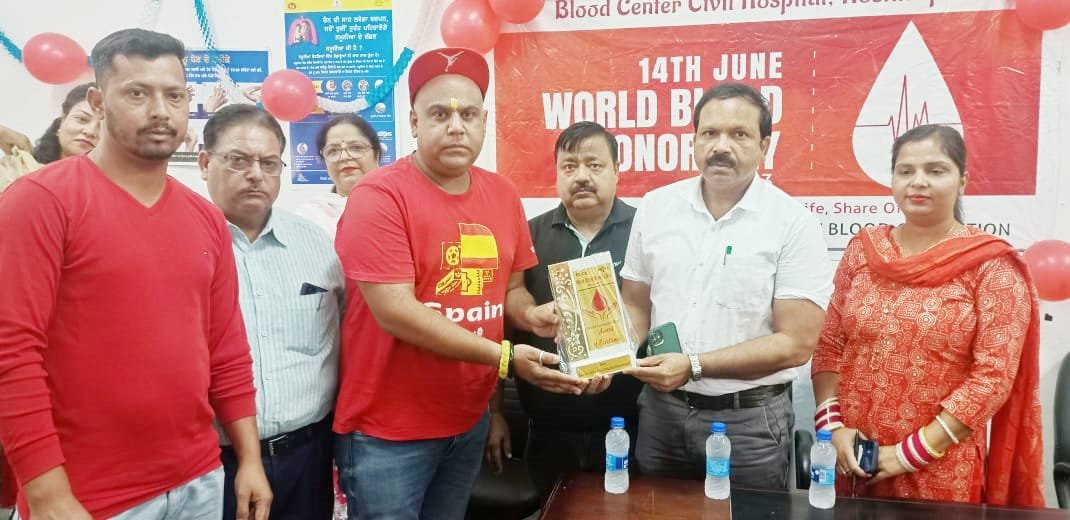 ਹੁਸ਼ਿਆਰਪੁਰ 27 ਜੂਨ (ਤਰਸੇਮ ਦੀਵਾਨਾ ) ਸਿਵਲ ਸਰਜਨ ਦੇ ਟਰੇਨਿੰਗ ਹਾਲ ਵਿਖੇ ਖੂਨਦਾਨੀਆਂ ਦਾ ਧੰਨਵਾਦ ਅਤੇ ਸਨਮਾਨ ਕਰਨ ਲਈ ਵਿਸ਼ੇਸ਼ ਪ੍ਰੋਗਰਾਮ ਕਰਵਾਇਆ ਗਿਆ ਜਿਸ ਵਿੱਚ ਸਿਵਲ ਸਰਜਨ ਡਾ.ਬਲਵਿੰਦਰ ਕੁਮਾਰ ਡਾਮਾਣਾ ਨੇ 24 ਐਨ.ਜੀ.ੳ ਅਤੇ ਸਵੈ-ਇੱਛਕ ਖੂਨਦਾਨੀਆਂ ਨੂੰ ਖੂਨਦਾਨ ਕਰਨ ਵਿੱਚ ਸਹਿਯੋਗ ਦੇਣ ਲਈ ਸਨਮਾਨਨਿਤ ਕੀਤਾ ਗਿਆ । ਇਸ ਮੌਕੇ ਸਹਾਇਕ ਸਿਵਲ ਸਰਜਨ ਡਾ.ਪਵਨ ਕੁਮਾਰ, ਹਾਜ਼ਰ ਸਨ । ਇਸ ਮੌਕੇ ਡਾ.ਬਲਵਿੰਦਰ ਕੁਮਾਰ ਨੇ ਖੂਨਦਾਨੀਆਂ ਨੂੰ ਸੰਬੋਧਨ ਕਰਦਿਆਂ ਕਿਹਾ ਕਿ ਵਿਸ਼ਵ ਖੂਨਦਾਤਾ ਦਿਵਸ ਸਾਰੀ ਦੁਨੀਆ ਵਿੱਚ 14 ਜੂਨ ਨੂੰ ਮਨਾਇਆ ਜਾਂਦਾ ਹੈ, ਜਿਸ ਦਾ ਮੱਕਸਦ ਖੂਨਦਾਨੀਆਂ ਨੂੰ ਸਵੈ-ਇੱਛਾ ਅਤੇ ਨਿਯਮਤ ਰੂਪ ਵਿੱਚ ਖੂਨਦਾਨ  ਕਰਨ ਲਈ ਪ੍ਰੇਰਿਤ ਕਰਨਾ ਹੈ । ਉਨਾਂ ਖੂਨਦਾਨ ਕਰਨ ਦੀ ਮਹੱਤਤਾ ਬਾਰੇ ਦੱਸਦਿਆਂ ਕਿਹਾ ਕਿ ਖੂਨਦਾਨ ਮਹਾਂ ਦਾਨ ਹੈ ।  ਸਹੀ ਸਮੇ ਤੇ ਖੂਨ ਦੀ ਉਪਲੱਭਦਤਾ ਨਾਲ ਕਈ ਕੀਮਤੀ ਜਾਨਾਂ ਬਚਾਈਆਂ ਜਾ ਸਕਦੀਆਂ ਹਨ। ਕਿਸੇ ਦੀ ਜਿੰਦਗੀ ਬਚਾਉਣਾ ਮਨੁੱਖ ਦਾ ਮਾਨਵਤਾ ਪ੍ਰਤੀ ਸਰਵਉੱਚ ਧਰਮ ਹੈ । ਸੰਸਾਰ ਵਿਚ ਕਿਸੇ ਵੀ ਵਿਅਕਤੀ ਨੂੰ ਕਿਸੇ ਵੀ ਵੇਲੇ ਖੂਨ ਦੀ ਲੋੜ ਪੈ ਸਕਦੀ ਹੈ। ਖੂਨਦਾਨ ਆਪਣੇਆਪ ਵਿਚ ਇਕ ਵਿਲੱਖਣ ਦਾਨ ਹੋਣ ਕਰਕੇ ਸਾਂਝੀਵਾਲਤਾ ਦਾ ਸੁਨੇਹਾ ਦਿੰਦਾ ਹੈ । ਖੂਨ ਦੀ ਇੱਕ ਇੱਕ ਬੂੰਦ ਬਹੁਤ ਕਿਮਤੀ ਹੈ ਜੋ ਕਿਸੇ ਵੀ ਮਰਦੇ ਹੋਏ ਵਿਅਕਤੀ ਨੂੰ ਜੀਵਨਦਾਨ ਦੇ ਸਕਦੀ ਹੈ। ਖੂਨਦਾਨ ਕਰਨਾ ਵੀ ਮਾਨਵਤਾ ਦੀ ਸੇਵਾ ਕਰਨਾ ਹੈ । ਉਹਨਾਂ ਕਿਹਾ ਕਿ ਖੂਨਦਾਨ ਕਰਨ ਨਾਲ ਕਿਸੇ ਵੀ ਤਰ੍ਹਾਂ ਦੀ ਸਰੀਰ ਵਿੱਚ ਕਮਜ਼ੋਰੀ ਨਹੀਂ ਆਉਂਦੀ ਬਲਕਿ ਮਨ ਨੂੰ ਇੱਕ ਸੰਤੁਸ਼ਟੀ ਮਿਲਦੀ  ਹੈ ਕਿ ਅਸੀਂ ਇਹ ਦਾਨ ਕਰਕੇ ਇੱਕ ਲੋੜਵੰਦ ਵਿਅਕਤੀ ਨੂੰ ਜੀਵਨ ਪ੍ਰਦਾਨ ਕੀਤਾ ਹੈ। ਉਹਨਾਂ ਦੱਸਿਆ ਕਿ ਕੋਈ ਵੀ ਇਨਸਾਨ 17 ਸਾਲ ਦੀ ਉਮਰ ਤੋ ਲੈਕੇ 66 ਸਾਲ ਦੀ ਉਮਰ ਤੱਕ ਖੂਨ ਦਾਨ ਕਰ ਸਕਦਾ ਹੈ। ਉਨਾਂ ਹਾਜ਼ਰ ਐਨ.ਜੀ.ੳ ਦੇ ਮੈਂਬਰਾ ਦਾ ਧੰਨਵਾਦ ਕਰਦਿਆਂ ਕਿਹਾ ਕਿ ਭੱਵਿਖ ਵਿੱਚ ਉਹ ਮੱਨੁਖਤਾ ਦੀ ਸੇਵਾ ਲਈ ਇਸੇ ਤਰ੍ਹਾਂ ਆਪਣਾ ਸਹਿਯੋਗ ਦਿੰਦੇ ਰਹਿਣਗੇ ਤਾਂ ਕਿ ਸਮੇਂ ਰਹਿੰਦਿਆਂ ਕੀਮਤੀ ਜਾਨਾਂ ਬਚਾਈਆਂ ਜਾ ਸਕਣ। ਇਸ ਮੌਕੇ ਵਿਸ਼ੇ ਸੰਬੰਧੀ ਕਰਵਾਏ ਗਏ ਪੋਸਟਰ ਮੇਕਿੰਗ ਪ੍ਰਤੀਯੋਗਤਾ ਵਿੱਚ ਨਰਸਿੰਗ ਸਕੂਲ ਦੀਆਂ ਜੇਤੂ ਵਿਦਿਆਰਥਣਾਂ ਨੂੰ ਵੀ ਸਨਮਾਨਿਤ ਕੀਤਾ ਗਿਆ।
