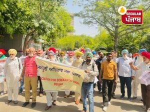 ਦਲਜੀਤ ਕੌਰ/ਦਿੱਲੀ, 21 ਮਈ, 2023: ਓਲੰਪੀਅਨ ਪਹਿਲਵਾਨਾਂ ਵਿਨੇਸ਼ ਫੋਗਾਟ, ਬਜਰੰਗ ਪੂਨੀਆ ਤੇ ਸਾਕਸ਼ੀ ਮਲਿਕ ਦੀ ਅਗਵਾਈ ਹੇਠ ਜੰਤਰ ਮੰਤਰ ਦਿੱਲੀ ਵਿਖੇ ਹੋ ਰਹੇ ਸੰਘਰਸ਼ ਵਿਚ ਜਮਹੂਰੀ ਅਧਿਕਾਰ ਸਭਾ ਪੰਜਾਬ ਵਲੋਂ ਸੀਨੀਅਰ ਮੀਤ ਪ੍ਰਧਾਨ ਪ੍ਰੋਫੈਸਰ ਏ ਕੇ ਮਲੇਰੀ ਅਤੇ ਜਥੇਬੰਦਕ ਸਕੱਤਰ ਨਰਭਿੰਦਰ ਸਿੰਘ ਦੀ ਅਗਵਾਈ ਹੇਠ ਸਭਾ ਦੇ ਸਰਗਰਮ ਸਾਥੀ ਮੈਂਬਰਾਂ ਨਾਲ ਮੋਦੀ ਸਰਕਾਰ ਵਿਰੁੱਧ ਨਾਅਰੇਬਾਜ਼ੀ ਕੀਤੀ ਅਤੇ ਹੱਕ-ਸੱਚ ਦੀ ਲੜਾਈ ਵਿੱਚ ਇਕਮੁੱਠਤਾ ਪ੍ਰਗਟ ਕੀਤੀ। ਜਮਹੂਰੀ ਅਧਿਕਾਰ ਸਭਾ ਤਹਿ ਕੀਤੇ ਪ੍ਰੋਗਰਾਮ ਅਨੁਸਾਰ ਸੰਗਰੂਰ, ਬਰਨਾਲਾ, ਬਠਿੰਡਾ, ਪਟਿਆਲਾ, ਲੁਧਿਆਣਾ, ਤਰਨਤਾਰਨ ਤੋਂ ਸਭਾ ਦੇ ਮੈਂਬਰਾਂ ਵੱਲੋਂ ਬੰਗਲਾ ਸਾਹਿਬ ਦਿੱਲੀ ਗੁਰਦੁਆਰਾ ਸਾਹਿਬ ਇਕੱਠੇ ਹੋ ਕੇ ਜੰਤਰ ਮੰਤਰ ਤੱਕ ਇਕ ਰੋਸ ਮਾਰਚ ਕੱਢਿਆ।