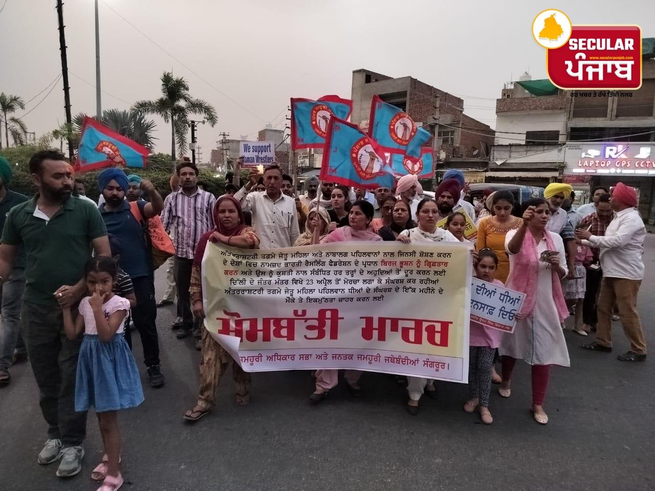 ਦਲਜੀਤ ਕੌਰ/ਸੰਗਰੂਰ, 24 ਮਈ, 2023: ਇੱਕ ਮਹੀਨੇ ਤੋਂ ਦਿੱਲੀ ਦੇ ਜੰਤਰ ਮੰਤਰ ਵਿਖੇ ਆਪਣੀ ਇੱਜ਼ਤ ਅਤੇ ਮਾਣ ਸਨਮਾਨ ਦੀ ਰਾਖੀ ਲਈ ਅੰਤਰਰਾਸ਼ਟਰੀ ਤਗਮੇ ਜੇਤੂ ਮਹਿਲਾ ਪਹਿਲਵਾਨਾਂ ਵਲੋਂ ਜਾਰੀ ਸੰਘਰਸ਼ ਸੰਬੰਧੀ ਪ੍ਰਧਾਨ ਮੰਤਰੀ ਨਰਿੰਦਰ ਮੋਦੀ ਵਲੋਂ ਧਾਰੀ ਸਾਜ਼ਿਸ਼ੀ ਚੁੱਪ ਦਾ ਗੰਭੀਰ ਨੋਟਿਸ ਲੈਂਦਿਆਂ ਅੱਜ ਇਥੇ ਜਮਹੂਰੀ ਅਧਿਕਾਰ ਸਭਾ ਦੇ ਸੱਦੇ ਤੇ ਵੱਖ ਵੱਖ ਜਨਤਕ ਜਮਹੂਰੀ ਜਥੇਬੰਦੀਆਂ ਵਲੋਂ ਮੋਮਬੱਤੀਆਂ ਹੱਥਾਂ ਵਿਚ ਫੜਕੇ ਰੋਹ ਭਰਪੂਰ ਪ੍ਰਦਰਸ਼ਨ ਕੀਤਾ।