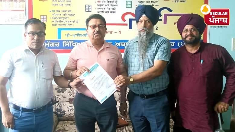 ਕੈਪਸ਼ਨ- ਜਿ਼ਲ੍ਹਾ ਸਿੱਖਿਆ ਅਫਸਰ (ਪ੍ਰਾ) ਸੰਜੀਵ ਗੌਤਮ ਅਤੇ ਉਪ-ਜਿ਼ਲ੍ਹਾ ਸਿੱਖਿਆ ਅਫਸਰ (ਪ੍ਰਾ) ਸੁਖਵਿੰਦਰ ਸਿੰਘ ਨੂੰ ਮੰਗ ਪੱਤਰ ਦਿੰਦੇ ਹੋਏ ਸੰਦੀਪ ਸ਼ਰਮਾ ਅਤੇ ਜਸਵਿੰਦਰ ਸਿੰਘ ਸਹੋਤਾ।