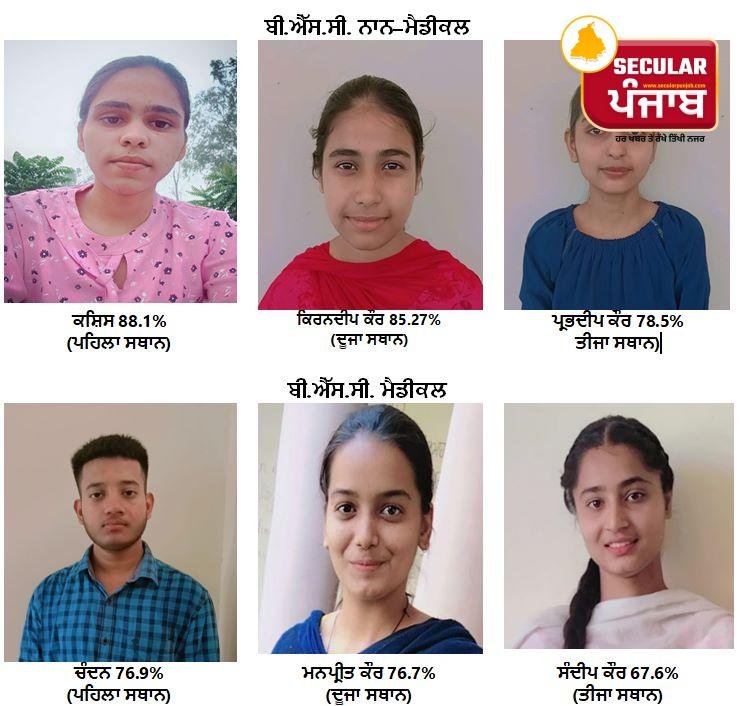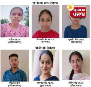 ਨਤੀਜਿਆਂ ਵਿੱਚ ਕਸ਼ਿਸ, ਕਿਰਨਦੀਪ ਕੌਰ ਅਤੇ ਪ੍ਰਭਦੀਪ ਕੌਰ ਨੇ ਬੀ.ਐੱਸ.ਸੀ. ਨਾਨ-ਮੈਡੀਕਲ ਭਾਗ ਪਹਿਲਾ ਵਿੱਚ ਕ੍ਰਮਵਾਰ 88.1%, 85.27% ਅਤੇ 78.5% ਅੰਕ ਪ੍ਰਾਪਤ ਕੀਤੇ। ਜਦੋਂ ਕਿ ਚੰਦਨ, ਮਨਪ੍ਰੀਤ ਕੌਰ ਅਤੇ ਸੰਦੀਪ ਕੌਰ ਨੇ ਬੀ.ਐੱਸ.ਸੀ. ਮੈਡੀਕਲ ਭਾਗ ਪਹਿਲਾ ਵਿੱਚ ਕ੍ਰਮਵਾਰ 76.9%, 76.7% ਅਤੇ 67.6% ਅੰਕ ਪ੍ਰਾਪਤ ਕਰਕੇ ਪਹਿਲਾ, ਦੂਜਾ ਅਤੇ ਤੀਜਾ ਸਥਾਨ ਪ੍ਰਾਪਤ ਕੀਤਾ।
