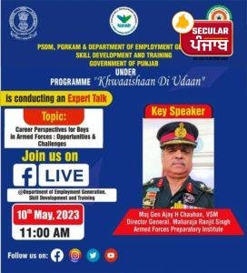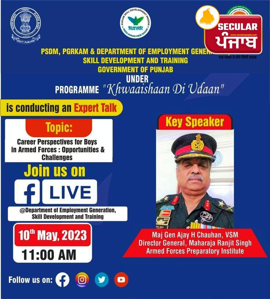 ਦਲਜੀਤ ਕੌਰ/ਸੰਗਰੂਰ, 9 ਮਈ, 2023: ਰੋਜ਼ਗਾਰ ਉਤਪੱਤੀ ਹੁਨਰ ਵਿਕਾਸ ਅਤੇ ਸਿਖਲਾਈ ਵਿਭਾਗ, ਪੰਜਾਬ ਵੱਲੋਂ ਪ੍ਰੋਗਰਾਮ “ਖਵਾਹਿਸ਼ਾਂ ਦੀ ਉਡਾਨ” ਤਹਿਤ ਲੜਕਿਆਂ ਲਈ ਭਾਰਤੀ ਫੌਜ ਵਿੱਚ ਕੈਰੀਅਰ ਦੇ ਮੌਕਿਆਂ ਸੰਬੰਧੀ 10 ਮਈ ਨੂੰ ਸਵੇਰੇ 11:00 ਵਜੇ ਆਨਲਾਈਨ ਵੈਬੀਨਾਰ ਕਰਵਾਇਆ ਜਾ ਰਿਹਾ ਹੈ। ਇਸ ਸੰਬੰਧੀ ਜ਼ਿਲ੍ਹਾ ਰੋਜ਼ਗਾਰ ਅਫਸਰ ਸ੍ਰੀ ਰਵਿੰਦਰਪਾਲ ਸਿੰਘ ਨੇ ਜਾਣਕਾਰੀ ਦਿੰਦੇ ਹੋਏ ਦੱਸਿਆ ਕਿ ਇਸ ਵੈੱਬੀਨਾਰ ਵਿੱਚ ਮਹਾਰਾਜਾ ਰਣਜੀਤ ਸਿੰਘ ਆਰਮਡ ਫੋਰਸਿਸ ਪ੍ਰਾਪਰੇਟਰੀ ਇੰਸਟੀਚਿਊਟ ਦੇ ਮੇਜਰ ਜਨਰਲ ਅਜੇ ਐਚ.ਚੌਹਾਨ ਵੀ ਐਸ.ਐੱਮ ਡਾਇਰੈਕਟਰ ਜਨਰਲ ਵੱਲੋਂ ਇਸ ਵਿਸ਼ੇ ਤੇ ਵਿਸਥਾਰਪੂਰਵਕ ਗੱਲ ਕੀਤੀ ਜਾਵੇਗੀ।