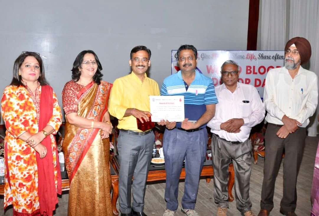 ਦਲਜੀਤ ਕੌਰ/ਭਵਾਨੀਗੜ੍ਹ, 29 ਜੂਨ, 2023: ਵਿਸ਼ਵ ਖ਼ੂਨਦਾਨੀ ਦਿਵਸ ਤੇ ਮਨਾਏ ਜਾ ਰਹੇ ਪੰਦਰਵਾੜੇ ਦੀ ਲੜੀ ਵਿੱਚ ਖੂਨਦਾਨ ਕੈਂਪ ਰਾਜਿੰਦਰਾ ਹਸਪਤਾਲ ਪਟਿਆਲਾ ਅਤੇ ਪੰਜਾਬ ਸਟੇਟ ਏਡਜ਼ ਕੰਟਰੋਲ ਸੁਸਾਇਟੀ ਪੰਜਾਬ ਦੇ ਸਹਿਯੋਗ ਨਾਲ ਇੱਕ ਸਨਮਾਨ ਸਮਾਗਮ ਦਾ ਆਯੋਜਨ ਕੀਤਾ ਗਿਆ। ਜਿਸ ਵਿੱਚ ਸਵੈ ਇੱਛਕ ਖੂਨਦਾਨੀਆਂ ਅਤੇ ਖੂਨਦਾਨ ਲਹਿਰ ਵਿੱਚ ਵਡਮੁੱਲਾ ਯੋਗਦਾਨ ਪਾਉਣ ਵਾਲੀਆਂ ਸ਼ਖ਼ਸੀਅਤਾਂ ਨੂੰ ਸਨਮਾਨਿਤ ਕੀਤਾ ਗਿਆ। ਇਸ ਸਮਾਗਮ ਵਿੱਚ ਰੋਟਰੀ ਕਲੱਬ ਦੇ ਸਾਬਕਾ ਗਵਰਨਰ ਧਰਮਵੀਰ ਗਰਗ ਨੂੰ ਉਚੇਚੇ ਤੌਰ ਤੇ ਸਨਮਾਨਿਤ ਕੀਤਾ ਗਿਆ ਅਤੇ ਉਹਨਾਂ ਵੱਲੋਂ ਖੂਨਦਾਨ ਲਹਿਰ ਵਿੱਚ ਪਾਏ ਗਏ ਯੋਗਦਾਨ ਨੂੰ ਸਭ ਨਾਲ ਸਾਂਝਾ ਕੀਤਾ ਗਿਆ।