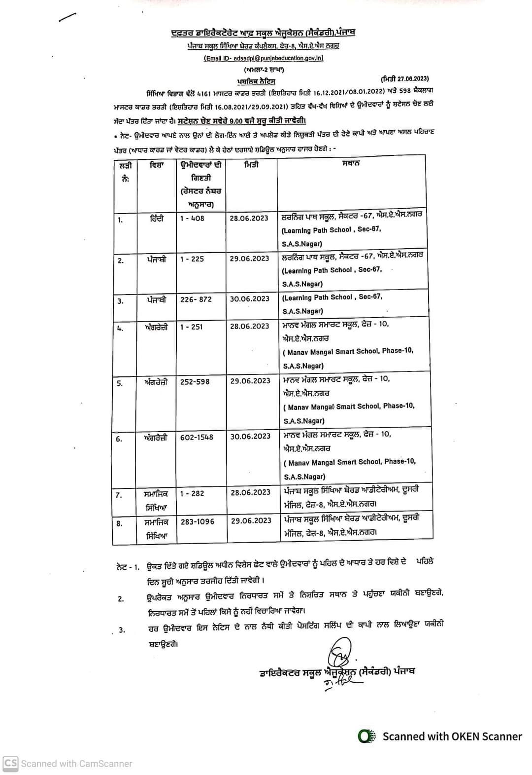 ਦਲਜੀਤ ਕੌਰ/ਚੰਡੀਗੜ੍ਹ, 27 ਜੂਨ, 2023: ਸਿੱਖਿਆ ਵਿਭਾਗ ਵੱਲੋਂ ਨਵ ਨਿਯੁਕਤ ਹੋਏ 4161 ਮਾਸਟਰ ਕਾਡਰ ਅਧਿਆਪਕਾਂ ਨੂੰ ਸਟੇਸ਼ਨ ਚੋਣ ਸਬੰਧੀ ਬੁਲਾਇਆ ਗਿਆ ਹੈ। ਸਿੱਖਿਆ ਵਿਭਾਗ ਵੱਲੋਂ 4161 ਮਾਸਟਰ ਕਾਡਰ ਭਰਤੀ (ਇਸਤਿਹਾਰ ਮਿਤੀ 16.12.2021/08.01.2012) ਅਤੇ 598 ਬੈਕਲਾਗ ਮਾਸਟਰ ਕਾਡਰ ਭਰਤੀ (ਇਸ਼ਤਿਹਾਰ ਮਿਤੀ 16.08.2021/29.09.2021) ਤਹਿਤ ਵੱਖ-ਵੱਖ ਵਿਸ਼ਿਆਂ ਦੇ ਉਮੀਦਵਾਰਾਂ ਨੂੰ ਸਟੇਸਨ ਚੋਣ ਲਈ ਸੱਦਾ ਪੱਤਰ ਦਿੱਤਾ ਗਿਆ ਹੈ। ਸਟੇਸ਼ਨ ਚੋਣ ਸਵੇਰੇ 9:00 ਵਜੇ ਸ਼ੁਰੂ ਕੀਤੀ ਜਾਵੇਗੀ। ਉਮੀਦਵਾਰ ਆਪਣੇ ਨਾਲ ਉਨਾਂ ਦੀ ਲੋਗ-ਇੰਨ ਆਈ ਤੇ ਅਪਲੋਡ ਕੀਤੇ ਨਿਯੁਕਤੀ ਪੱਤਰ ਦੀ ਫੋਟੋ ਕਾਪੀ ਅਤੇ ਆਪਣਾ ਅਸਲ ਪਹਿਚਾਣ ਪੱਤਰ (ਆਧਾਰ ਕਾਰਡ ਜਾਂ ਵੋਟਰ ਕਾਡਰ) ਲੈ ਕੇ ਵੈਬਸਾਈਟ ਤੇ ਦਰਸਾਏ ਸਡਿਊਲ ਅਨੁਸਾਰ ਹਾਜਰ ਹੋਣਗੇ।